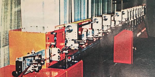 Here's another version of our fully automated Venetian blind machine. This particular model is mechanical and is 32' long with multi abilities to manufacture different gauges of Venetian blinds. For example, it was able to manufacture 1/2" and 1" Venetian blinds simultaneously. This machine was revolutionary to the industry with many aspects of the machine holding patents.