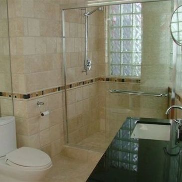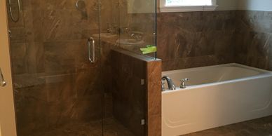 In this newly renovated bathroom, the customer chose a 13 x 13 Italian porcelain tile supplied by Julian Tile. The floor was tiled and we then continued the floor tile up the shower walls. We finished the shower unit with matching mosaic floor tile and continued the same mosaic tile as a border around the bathtub.