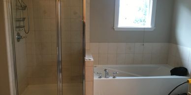 The master bathroom was gutted and was rebuilt with a tile shower stall, new tile throughout the washroom, a Schluter floor drain in the shower , an adjustable height handheld shower head and a custom made frameless shower door.