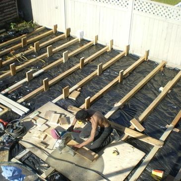This raised backyard deck was constructed to utilize the entire yard footage. Creating two levels allowed us to separate the areas enabling a gazebo with outdoor sofa and fire pit to encompass the upper level.