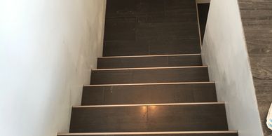 This tile stairway was completed using a 12 x 24 tile on the treads and kicks. To provide a beautiful aesthetic look to the stairs, the tile pattern was staggered to accentuate the stair design with a modern Schluter nosing to compliment the metal handrail and glass railing.