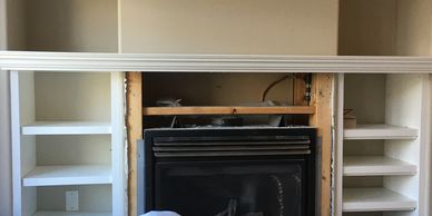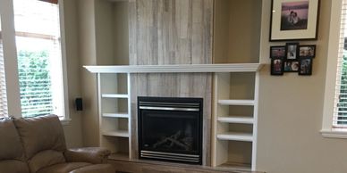 We installed rustic hardwood looking ceramic 6 x 24 tile vertically above the mantel to extend the look of the fireplace and to provide an accent wall in the great room. We continued the tile pattern below the mantel and along the hearth to provide continuity of design and to enhance as a decorative feature in the room.