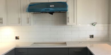 We installed a white subway tile in this newly renovated penthouse in Yaletown. The subway tile was 4 x 16 with a light grey grout used providing an accent that coordinated the backsplash tile with the flooring and cabinet colours.