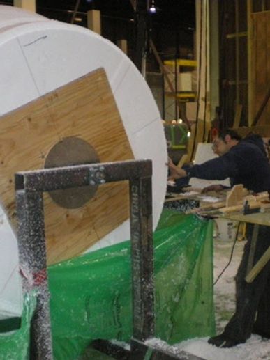 The photo shows Laszlo spinning the column base on the custom made lathe machine he built specifically for carving massive Styrofoam columns. Made for the movie "Night at the Museum", this base was constructed for a twenty foot column.